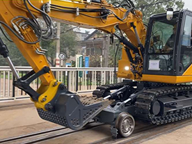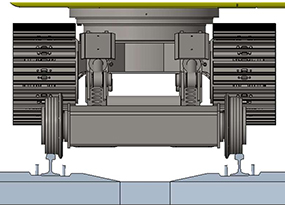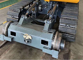安裝鐵路導(dǎo)向輪,履帶板采用橡膠板,能實(shí)現(xiàn)在鐵路線路上自由上下道,并確保在鋼軌上行走而不會(huì)損傷鋼軌。